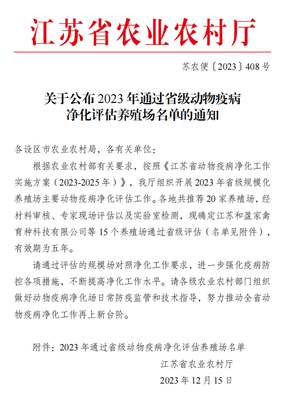 12月15日,江蘇省農業農村廳發布省級動物疫病凈化場名單蘇農便〔2023〕408 號,我司瑞鵬牧業經專家評審,被評為省級羊布魯氏菌病凈化場。